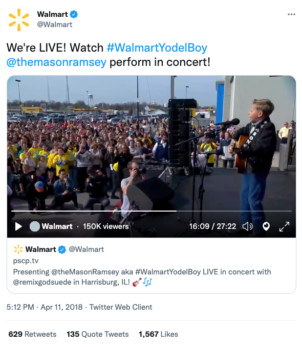 Our first assignment was to take advantage of a fast-breaking online phenomenon, Walmart Yodel Boy. On March 24, 2018, Mason Ramsey was videoed singing Hank Williams Sr.’s “Lovesick Blues” in the aisle of the Harrisburg, Illinois, Walmart. Posted to Facebook, in just a week it went viral with more than 11 million views.